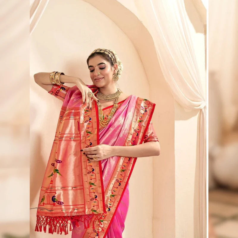 Pure Soft Tissue Silk Banarasi Paithani Baby Pink Saree