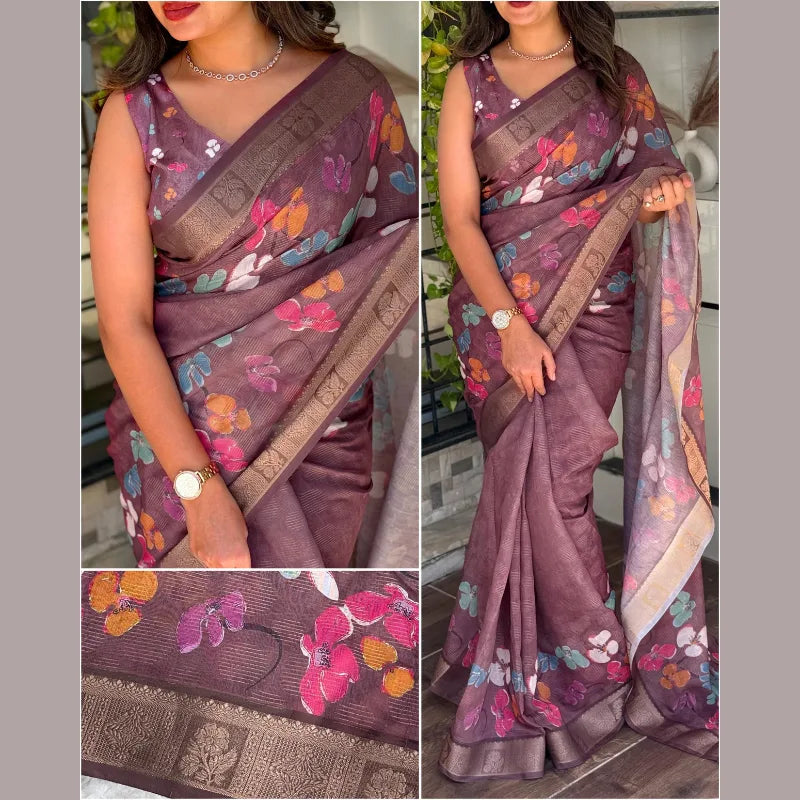 Pure Jute cotton silk with zari jacuard border and butta, digital 3 D flower printed saree , jamun color saree