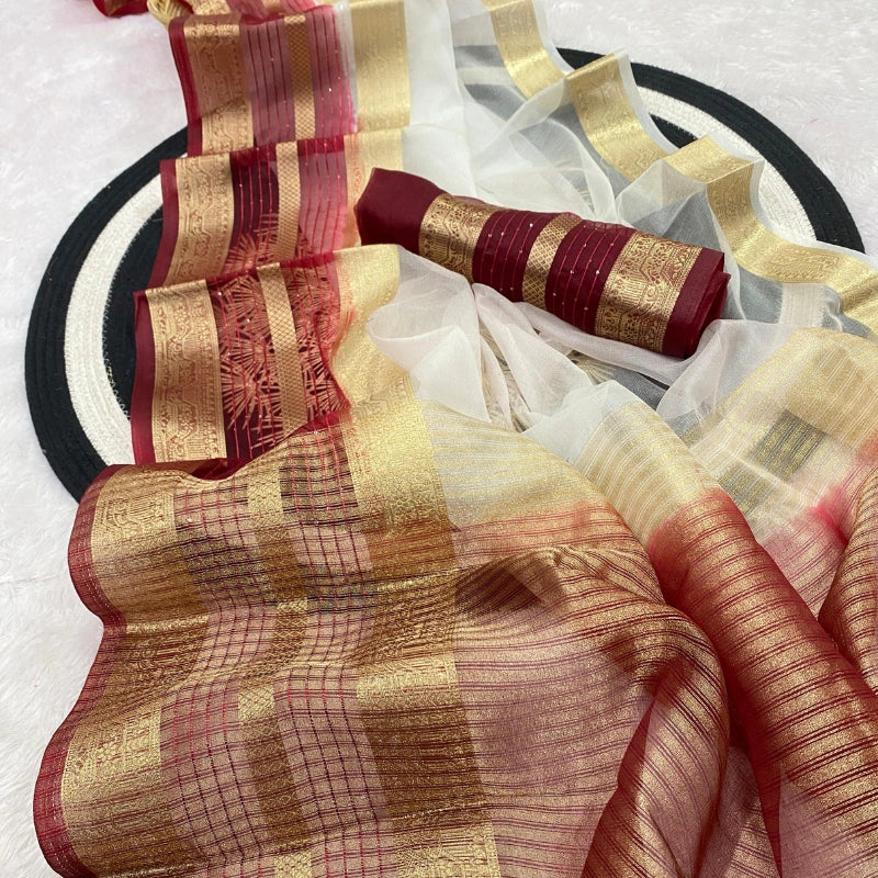 Tissue Khadi Organza Silk Jacquard White and Brick Red Border
