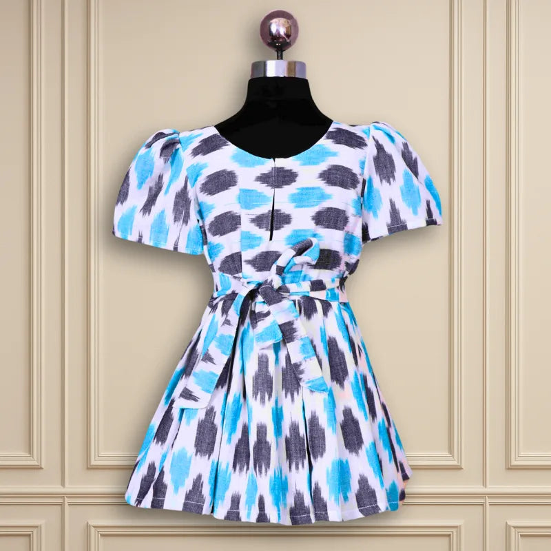 Beautiful casual wear ikkatt cotton waist frock white blue