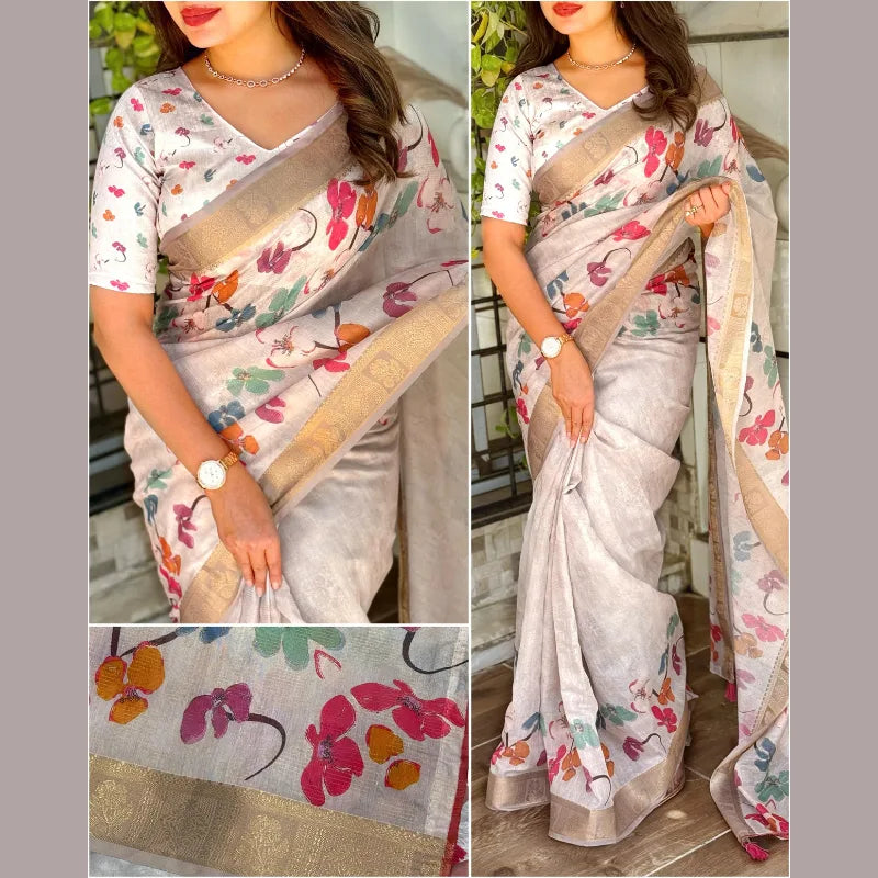 Pure Jute cotton silk with zari jacuard border and butta, digital 3 D flower printed saree , white color saree