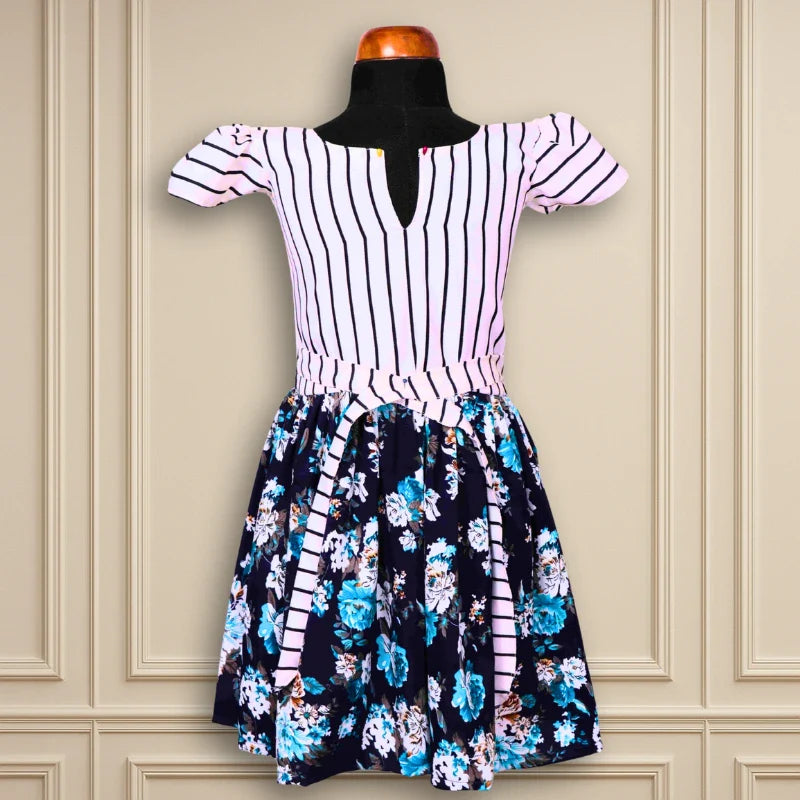 Color- white base with dark blue stripes for the yoke part and navy blue printed skirt.